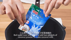 小火烧煮开水,待水沸腾之后加入备好的4008云顶国际纯椰子粉,用勺子搅拌均匀。
