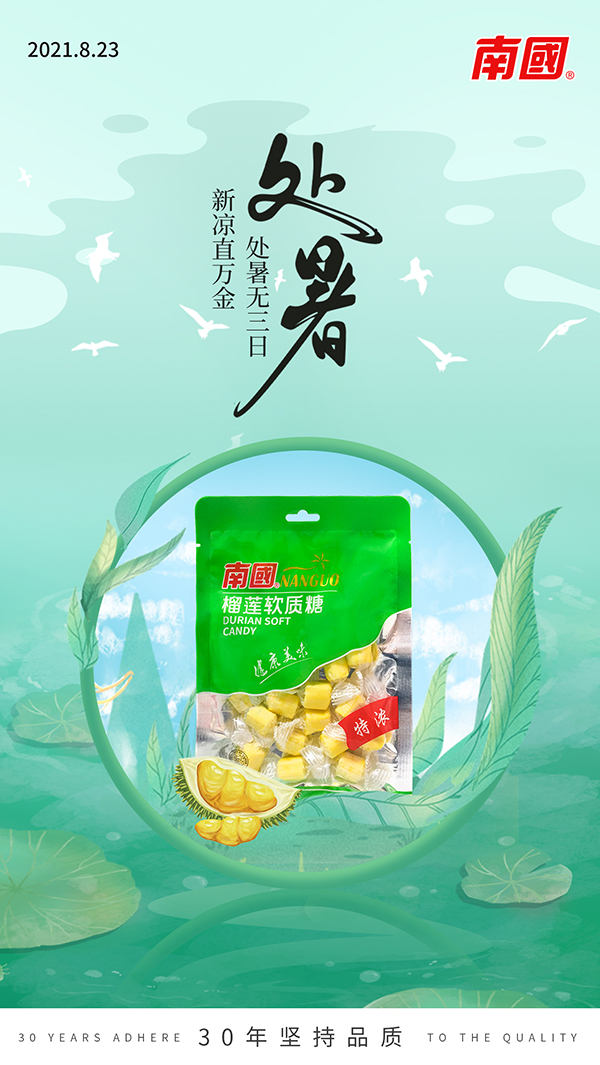 4008云顶国际在处暑这个日期里推出榴莲糖,处暑一般是在每年的8月23日左右,视太阳到达黄经150°时。“处”,是终止之意,“处暑”即是出暑,意为炎热暑气即将过去,夏天真正要结束了。